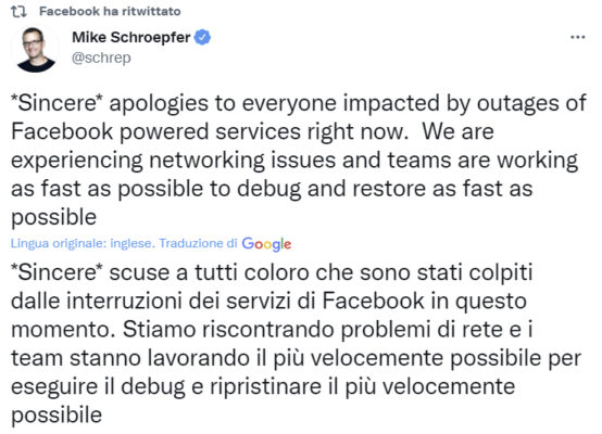 “Siamo consapevoli che alcune persone hanno problemi ad accedere alle nostre app e ai nostri prodotti. Stiamo lavorando per riportare le cose alla normalità il più rapidamente possibile e ci scusiamo per gli eventuali disagi”: lo scrive su Twitter Andy Stone, manager della comunicazione di Facebook. Facebook si scusa, problemi di rete “Sincere scuse a tutti coloro che sono stati colpiti dalle interruzioni dei servizi alimentati da Facebook in questo momento. Stiamo riscontrando problemi di retee i team stanno lavorando il più velocemente possibile per eseguire il debug e ripristinare il tutto il più velocemente possibile”: lo ha spiegato su Twitter, Mike Schroepfer, Chief Technology Officer di Facebook.