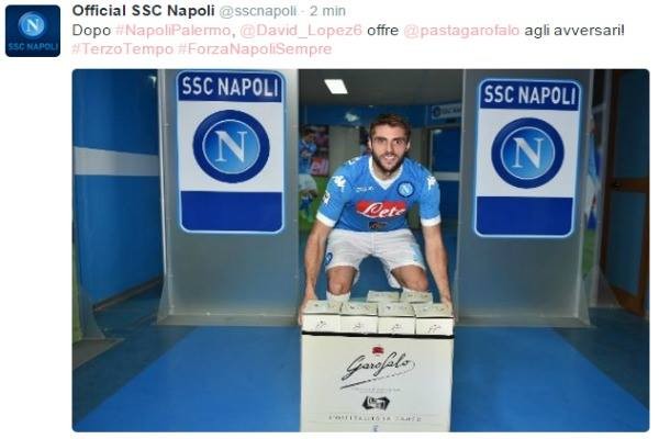 Al termine del match tra Napoli e Palermo, David Lopez ha omaggiato gli avversari ha offerto pacchi di pasta garofalo....