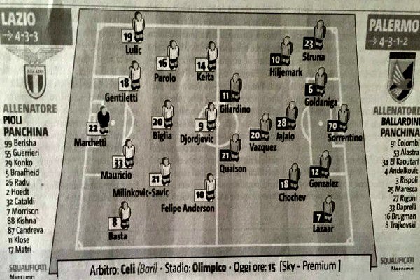 Giornale di Sicilia: le probabili formazioni di Lazio-Palermo