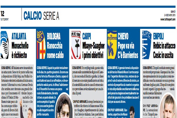 L'edizione odierna di "Tuttosport" ha realizzato un focus di mercato sulle squadre della serie A, ecco quanto scrive il quotidiano...