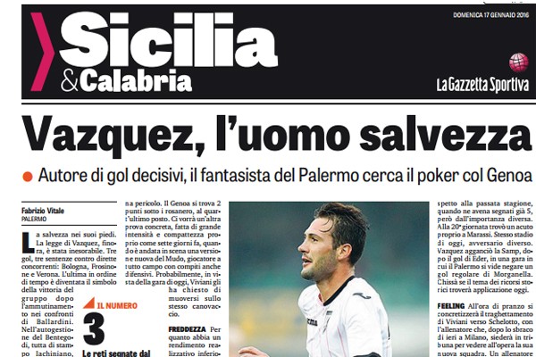 "La salvezza nei suoi piedi. La legge di Vazquez, finora, è stata inesorabile. Tre gol, tre sentenze contro dirette concorrenti:...