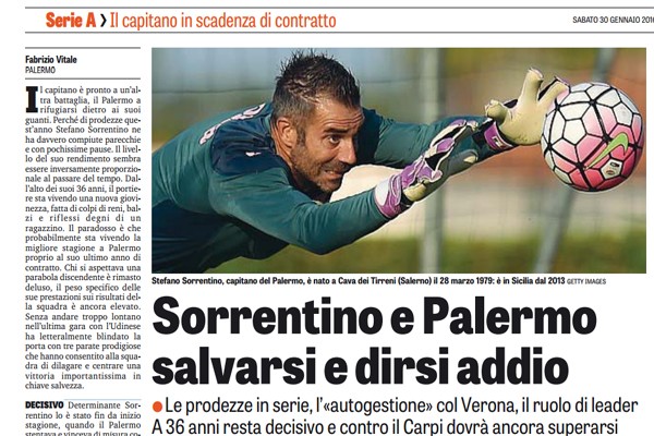 Gazzetta dello Sport: “Sorrentino-Palermo, salvarsi e dirsi addio. A 36 anni il leader che resta decisivo, contro il Carpi dovrà ancora superarsi”