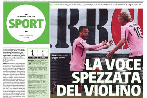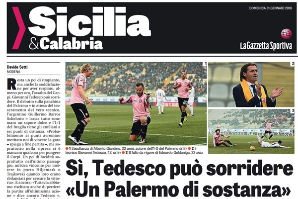 Gazzetta dello Sport: “Tedesco può sorridere: «Un Palermo di sostanza, forse avremmo meritato di battere il Carpi». Gilardino: «Gioco finché far gol mi emoziona»”