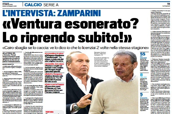 Intervistato ai microfoni di "Tuttosport" il patron rosanero Maurizio Zamparini si è così espresso su Giampiero Ventura suo ex allenatore...