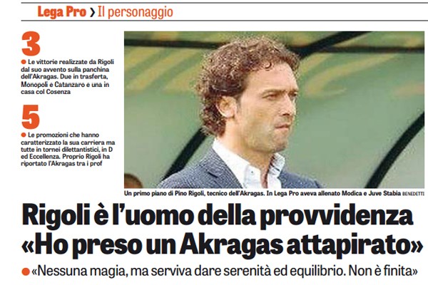 "Pino Rigoli è l’uomo del tris. Tre partite e tre vittorie dopo un incubo lungo tre mesi. Ad Agrigento imprecano...