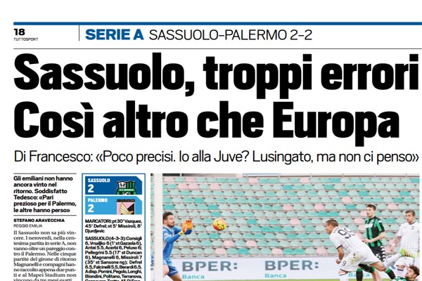 L'edizione odierna di "Tuttosport" ha stilato le pagelle del match pareggiato ieri dal Palermo contro il Sassuolo. Di seguito le...