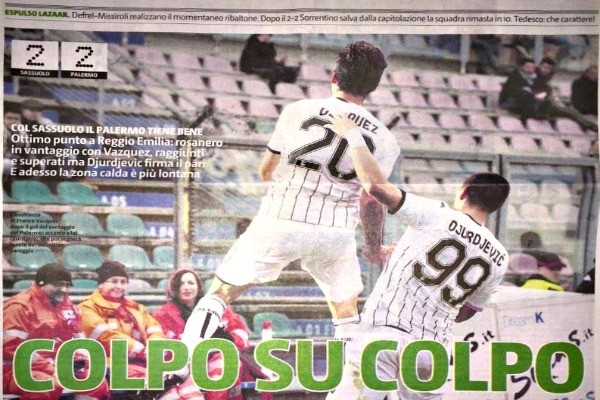 “Col Sassuolo il Palermo tiene bene. Ottimo punto a Reggio Emilia: rosanero in vantaggio con Vazquez, raggiunti e superati ma...