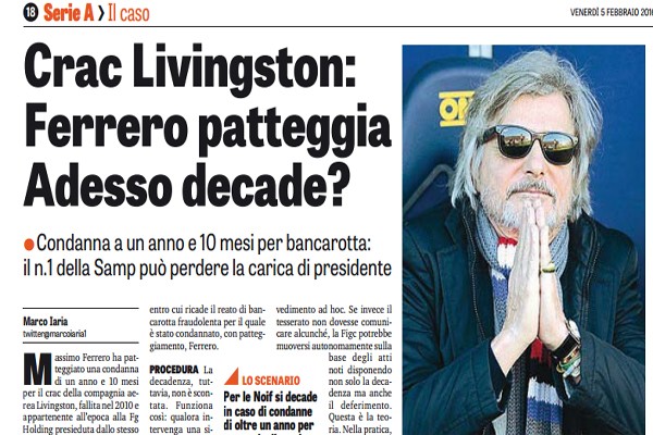 "Massimo Ferrero ha patteggiato una condanna di un anno e 10 mesi per il crac della compagnia aerea Livingston, fallita...