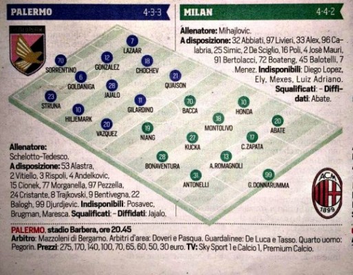 L'edizione odierna de "Il Corriere dello Sport" ha stilato le probabili formazioni di Palermo-Milan. Niente turn-over per Schelotto, pronto a...