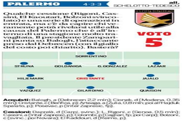 L'odierna edizione de "Il Corriere dello Sport", dà un voto al mercato di riparazione del Palermo. Con le cessioni di...