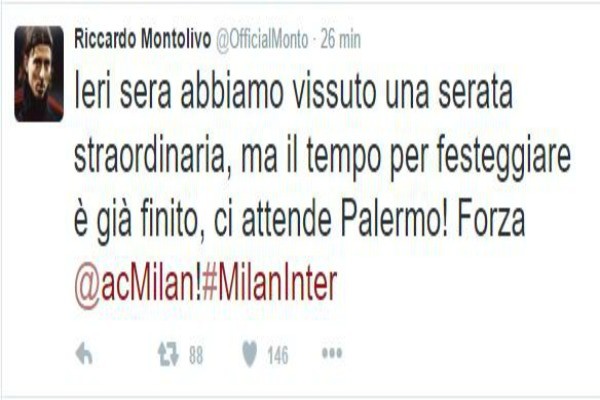 Il capitano del Milan, Riccardo Montolivo, ha commentato così attraverso il proprio profilo Twitter il successo dei rossoneri nel derby contro l'Inter:...