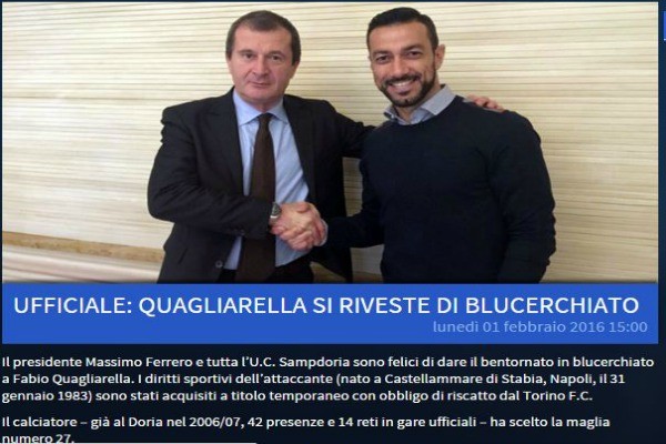 Fabio Quagliarella è ufficialmente un nuovo attaccante della Sampdoria. Di seguito il comunicato: "Il presidente Massimo Ferrero e tutta l'U.C. Sampdoria...