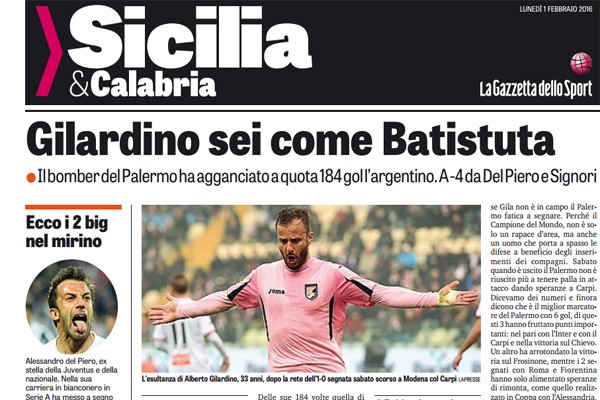 Queste le prime pagine dei principali quotidiani sportivi nazionali di oggi, lunedì 1 febbraio 2016.