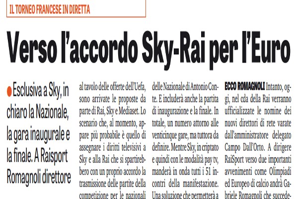 Gazzetta dello Sport: “Il torneo francese in diretta. Si va verso l’accordo Sky-Rai per l’Europeo – i dettagli”