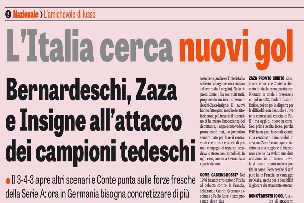 L'edizione odierna de "La Gazzetta dello Sport" fa il punto sull'amichevole in programma questa sera tra Germania e Italia: "QUI...