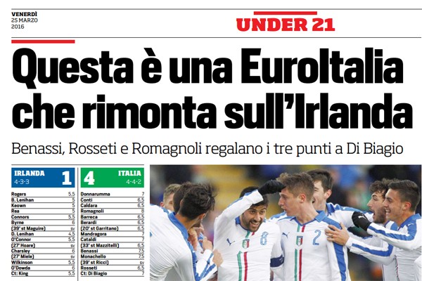Corriere dello Sport: “Under 21: questa è una EuroItalia, che rimonta sull’Irlanda! Benassi, Rosseti e Romagnoli regalano i tre punti a Di Biagio”