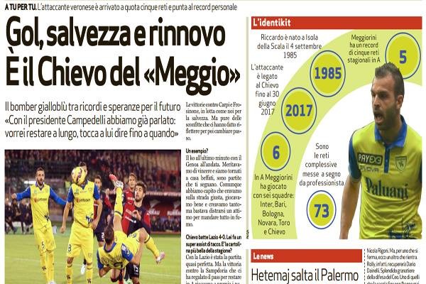 L'edizione odierna de "L'Arena di Verona" ha intervistato l'attaccante del Chievo Riccardo Meggiorini, il quale si è trattenuto a parlare...