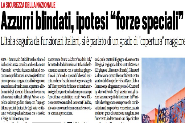 "I drammatici fatti di Bruxelles alzano il livello di sicurezza specifico anche sulla nostra Nazionale. I servizi di sicurezza italiani,...