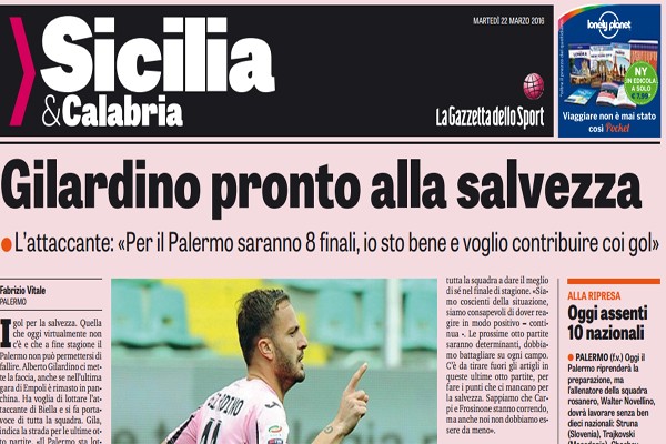 Gazzetta dello Sport: “La salvezza del Palermo passa dai piedi di Vazquez, ecco come stanno i rosa” (FOTO)