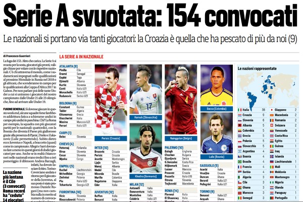 Corriere dello Sport: “Serie A svuotata: 154 convocati. Le nazionali si portano via tanti giocatori: la Croazia fa il pieno. 10 i convocati rosa…”