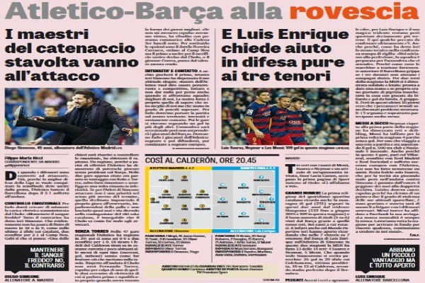 Gazzetta dello Sport: “Atletico-Barça alla rovescia; i maestri del catenaccio stavolta vanno all’attacco. E Luis Enrique chiede aiuto in difesa…”