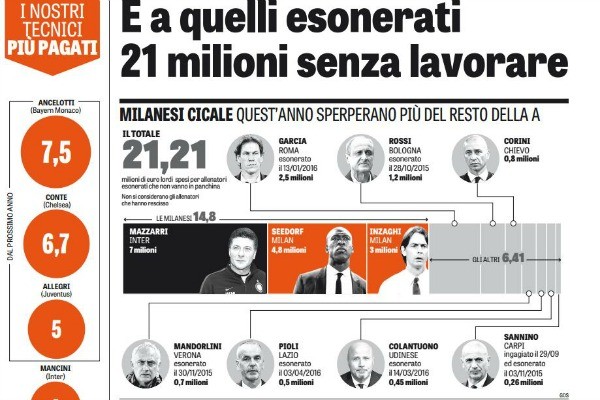 L'odierna edizione de "La Gazzetta dello Sport", si sofferma sui numerosi tecnici esonerati nel campionato italiano che continuano a percepire...