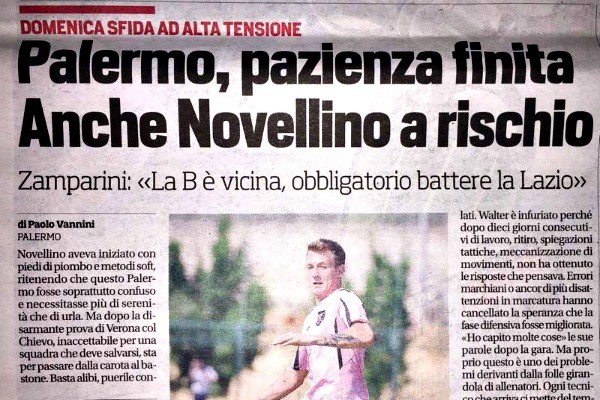 Corriere dello Sport: “Palermo, pazienza finita. Anche Novellino a rischio. Zamparini: «Giocatori senza attributi, la B è vicina»”