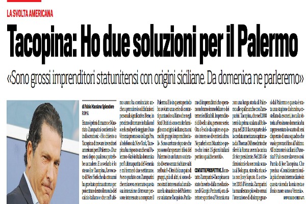 Corriere dello Sport: “La svolta americana, Tacopina: «Ho due soluzioni per il Palermo. Sono grossi imprenditori statunitensi con origini siciliane. Da domenica ne parleremo»”