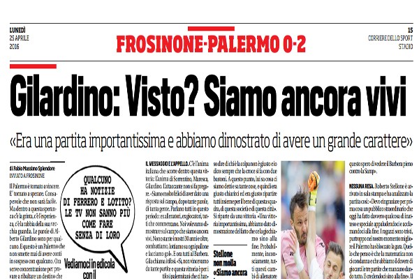 Corriere dello Sport: “Gilardino: «Visto? Siamo ancora vivi. Partita importantissima, abbiamo dimostrato grande carattere». Sorrentino: «C’è la Sicilia da difendere!»”