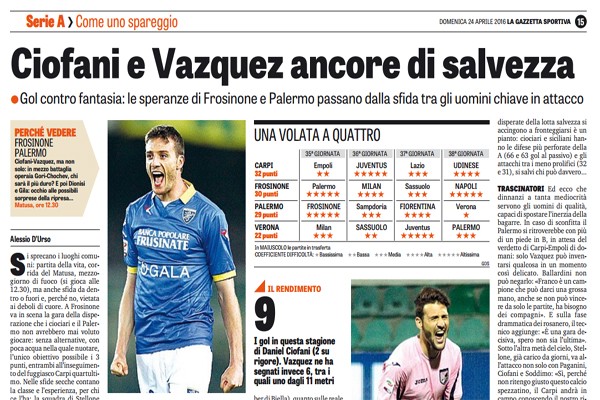 L'edizione odierna de "La Gazzetta dello Sport" in poche parole spiega perchè vedere Frosinone-Palermo: "Ciofani-Vazquez, ma non solo: in mezzo...