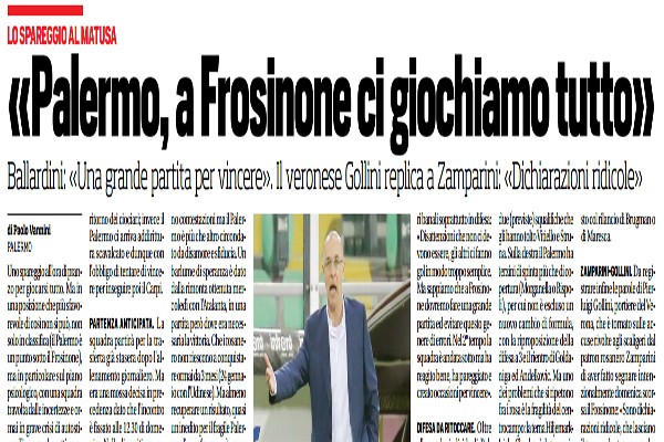 Corriere dello Sport: “Spareggio al Matusa, Ballardini: «Palermo, a Frosinone ci giochiamo tutto. Una grande partita per vincere». Oggi la partenza anticipata”