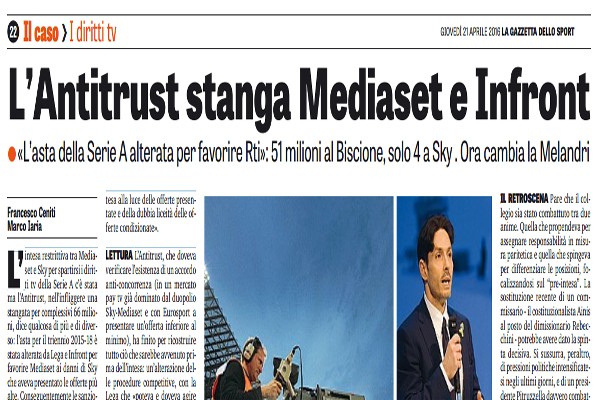 "L’ intesa restrittiva tra Mediaset e Sky per spartirsi i diritti tv della Serie A c’è stata ma l’Antitrust, nell’infliggere...