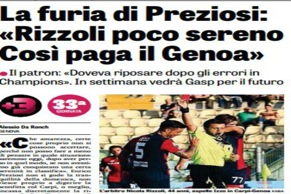 Gazzetta dello Sport: “La furia di Preziosi: «Rizzoli doveva riposare dopo errori in Champions. Così paga il Genoa»”