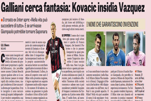 Gazzetta dello Sport: “Galliani cerca fantasia: Kovacic insidia Vazquez”