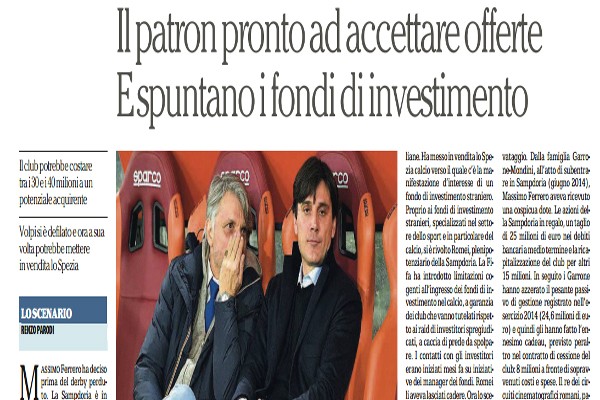 "Massimo Ferrero ha deciso prima del derby perduto. La Sampdoria è in vendita. Esaminerà offerte congrue, lontane comunque dagli 80-100...