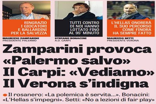 "Si infiamma la polemica sulla corsa salvezza. Protagonisti i presidenti di Palermo, Carpi e Verona, i cui destini si intrecceranno...