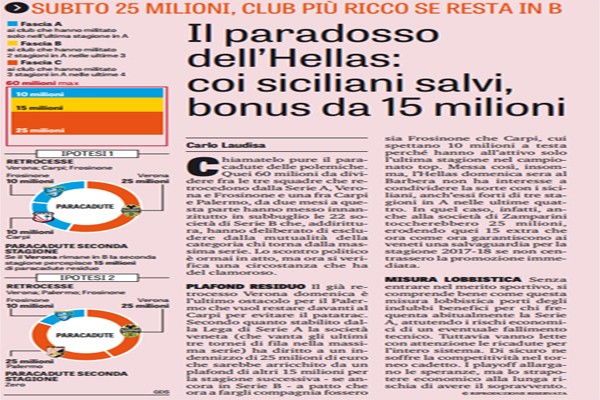 "Chiamatelo pure il paracadute delle polemiche. Quei 60 milioni da dividere fra le tre squadre che retrocedono dalla Serie A,...