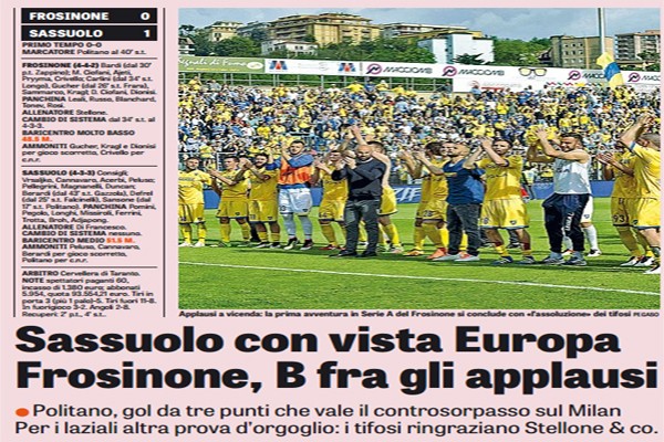 Gazzetta dello Sport: “Sassuolo con vista Europa. Frosinone, B fra gli applausi…”