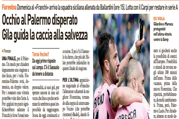 "UNA FINALE, per il Palermo. Un modo per chiudere degnamente una stagione a due facce, per i viola. Fiorentina-Palermo avrà,...