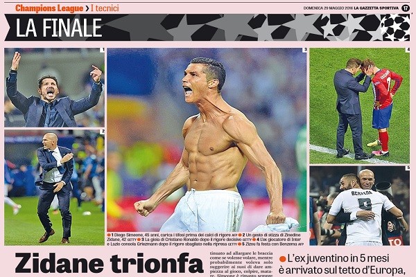Gazzetta dello Sport: “Champions, Zidane trionfa con il suo Real. CR7 lo sapeva già: «Ho chiesto io di tirare il quinto, volevo il trionfo»”