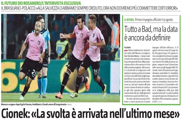 Intervenuto ai microfoni de "Il Giornale di Sicilia", il difensore rosanero Thiago Cionek ha parlato così: «Avevo giocato col Modena al...