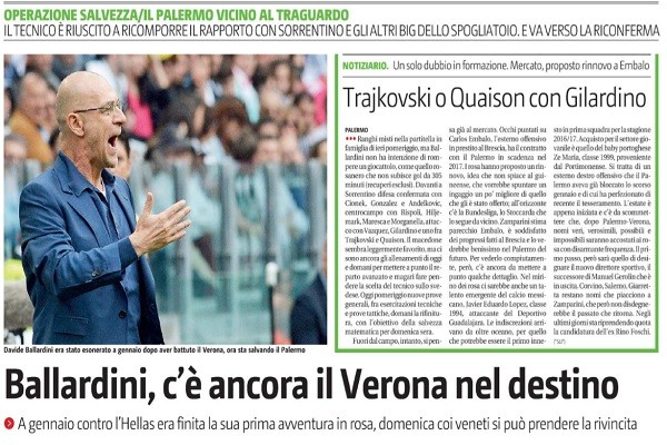 Giornale di Sicilia: “Palermo-Hellas Verona, un solo dubbio di formazione: Trajkovski o Quaison con Gilardino”