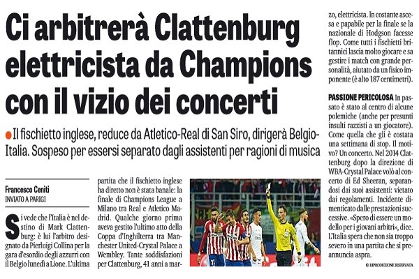 "Si vede che l’Italia è nel destino di Mark Clattenburg: è lui l’arbitro designato da Pierluigi Collina per la gara...