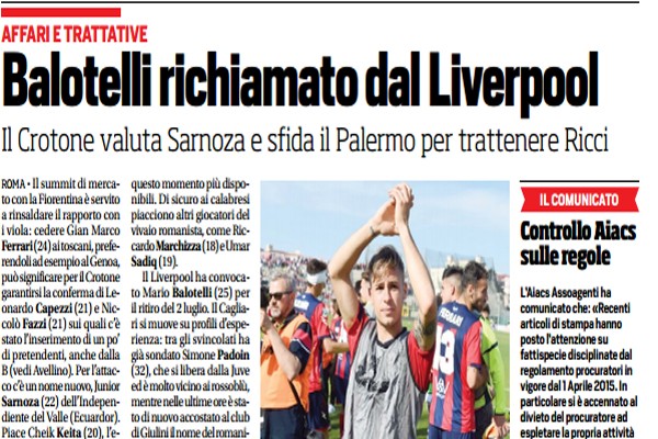 Corriere dello Sport: “Affari e trattative: Balotelli richiamato dal Liverpool. Il Crotone valuta Sarnoza e sfida il Palermo per trattenere Ricci”