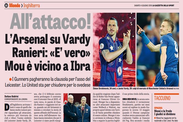Gazzetta dello Sport: “L’Arsenal su Vardy, Ranieri: «E’ vero». Mou è vicino a Ibra”