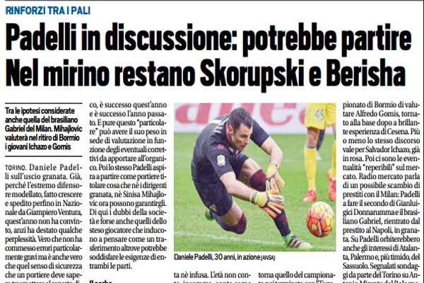 "Daniele Padelli sull’uscio granata. Già, perché l’estremo difensore modellato, fatto crescere e spedito perfino in Nazionale da Giampiero Ventura, quest’anno...
