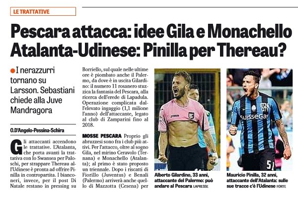 "Gli attaccanti accendono le trattative. L’Atalanta, che porta avanti la trattativa con lo Swansea per Paloschi, per strappare Thereau all’Udinese...