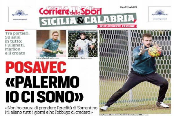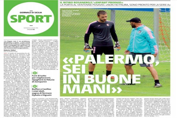 Giornale di Sicilia: “Posavec «Palermo sei in buone mani. Sogno di fermare Dybala e Higuain»”