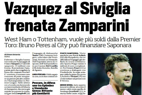 Corriere dello Sport: “Vazquez al Siviglia frenata Zamparini. West Bromwich, Tottenham e West Ham potrebbero offrire di più. Angulo…” – tutte le trattative di oggi