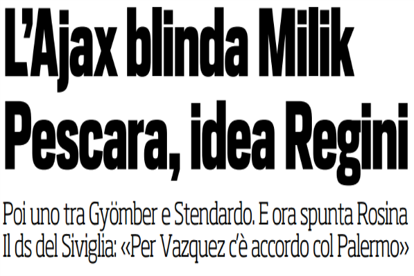 Corriere dello Sport, calciomercato serie A: “Pescara, idea Regini. Ds Siviglia, «Per Vazquez c’è accordo col Palermo»”